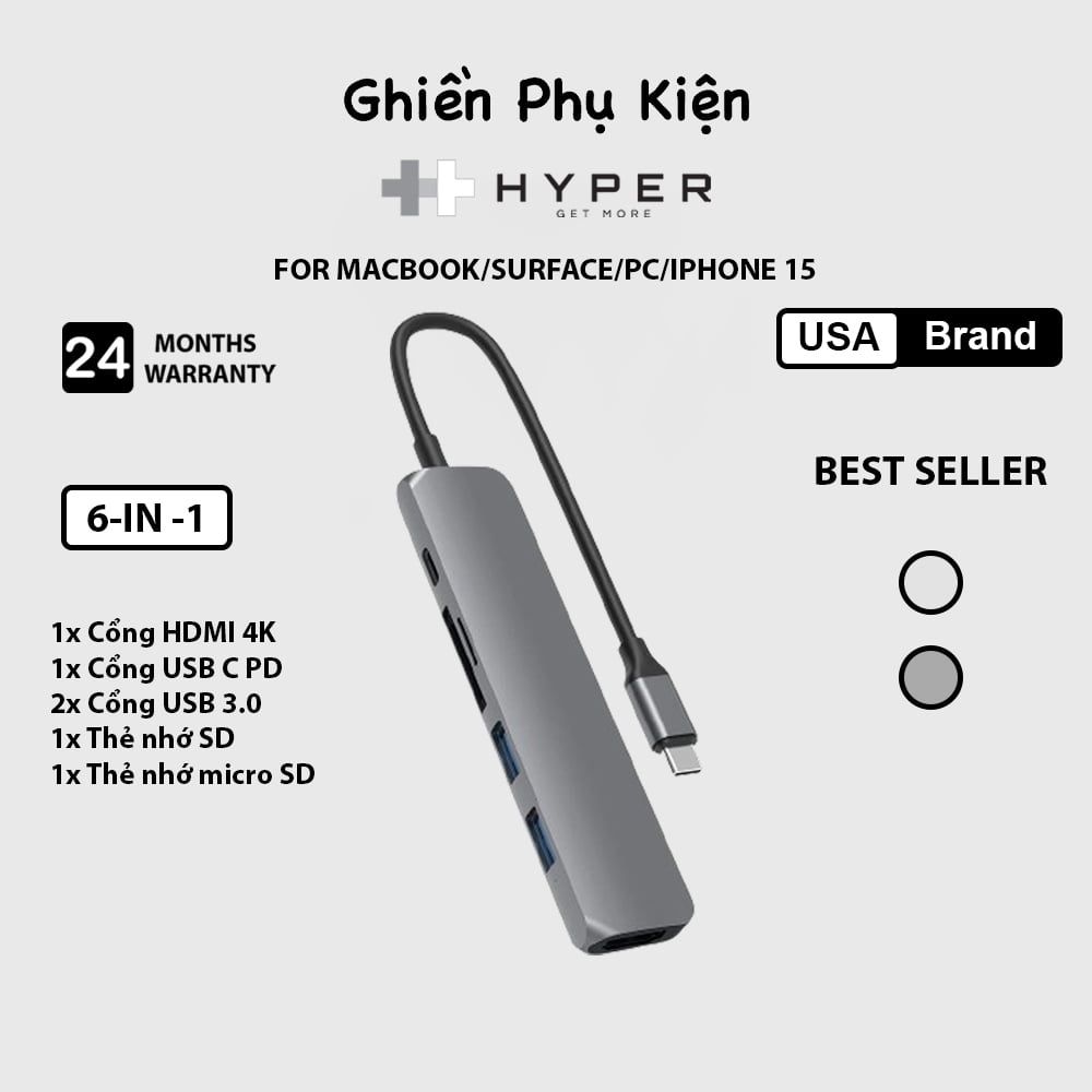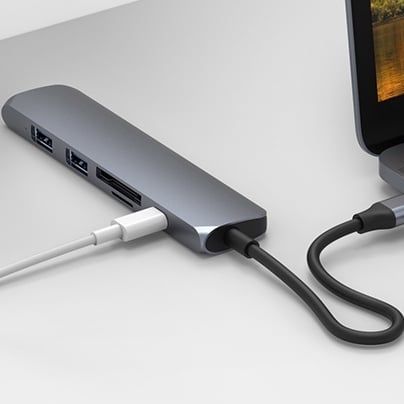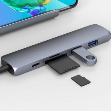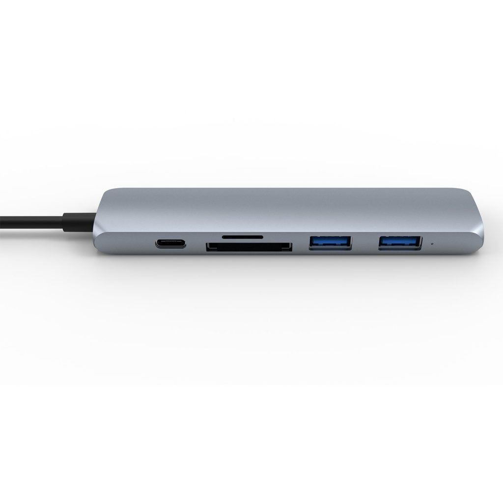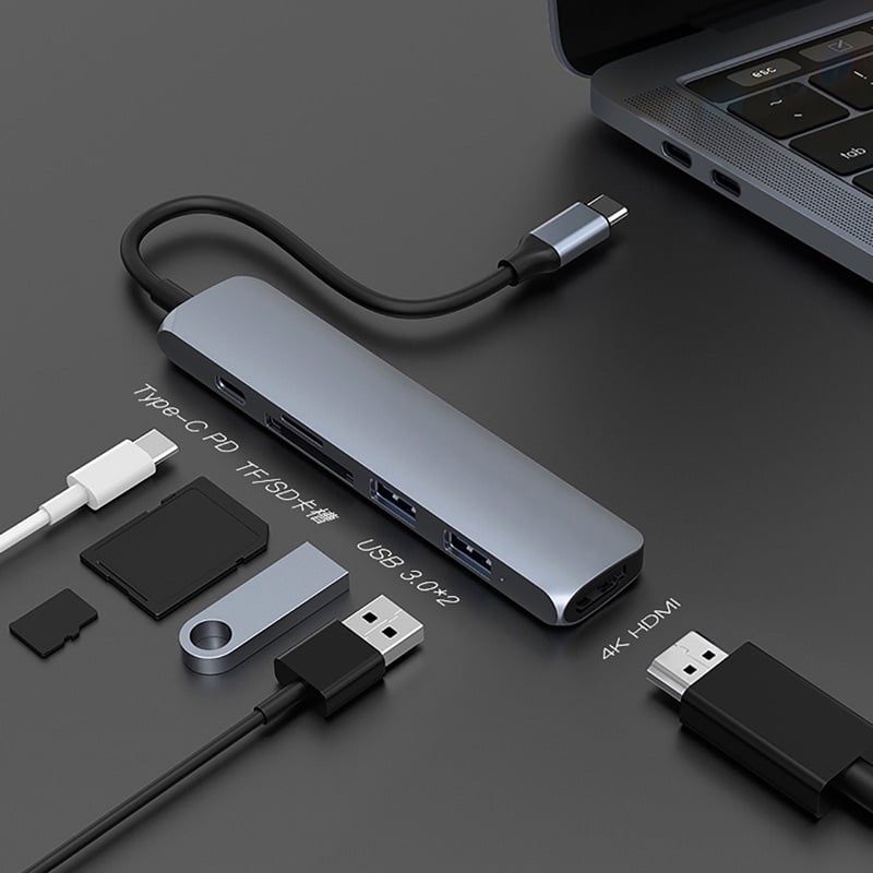 Bộ chia USB-C đa năng cho Mac.Book, Chromebook và PC. Bộ chuyển đổi USB-C siêu mỏng này có thêm 6 cổng: cấp nguồn USB-C, 2 x USB-A, 4K HDMI, micro SD và SD.