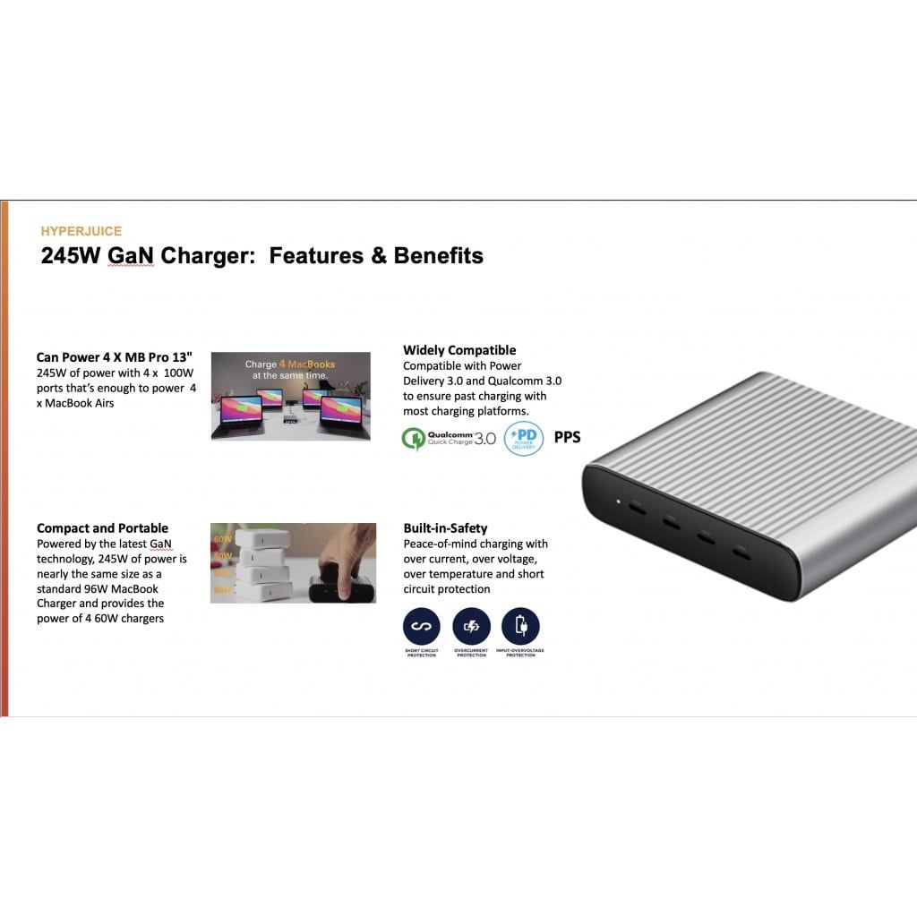 HyperJuice 245W USB-C GaN Charger là bộ sạc đa cổng USB-C có công suất cao nhất hiện nay trên thị trường. Mỗi cổng USB-C trên bộ sạc này hỗ trợ đầy đủ các tiêu chuẩn sạc phổ biến hiện nay gồm USB PD 3.0, nhánh mở rộng PPS phổ biến trên các thiết bị của Samsung, cùng với Quick Charge 4.0+ từ Qualcomm.