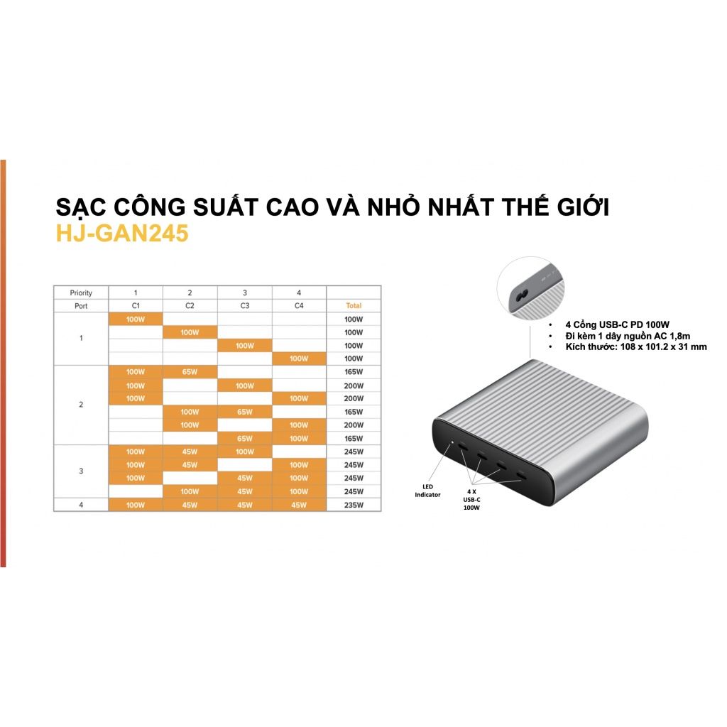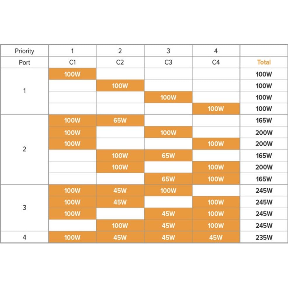 Sạc nhanh đồng thời 4 chiếc Mac với 4 công suất lần lượt 4 cổng là 100W-45W-45W-45W. Như vậy HyperJuice GAN 245W có thể cấp điện cùng lúc đủ cho 1 chiếc Mac Pro 16 inch và 3 thiết bị khác như 3 chiếc Macbook Air hoặc 1 chiếc mac Air và 2 i.Pad/ IP,…