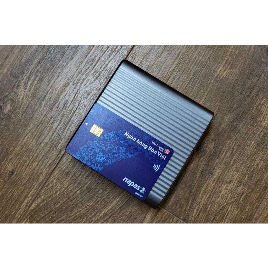 HyperJuice 245W USB-C GaN Charger có kích thước 10,5 x 10 x 3,2 cm, chiều dài và rộng của thiết bị lớn hơn 2 lần chiếc thẻ thanh toán kích thước tiêu chuẩn một chút.