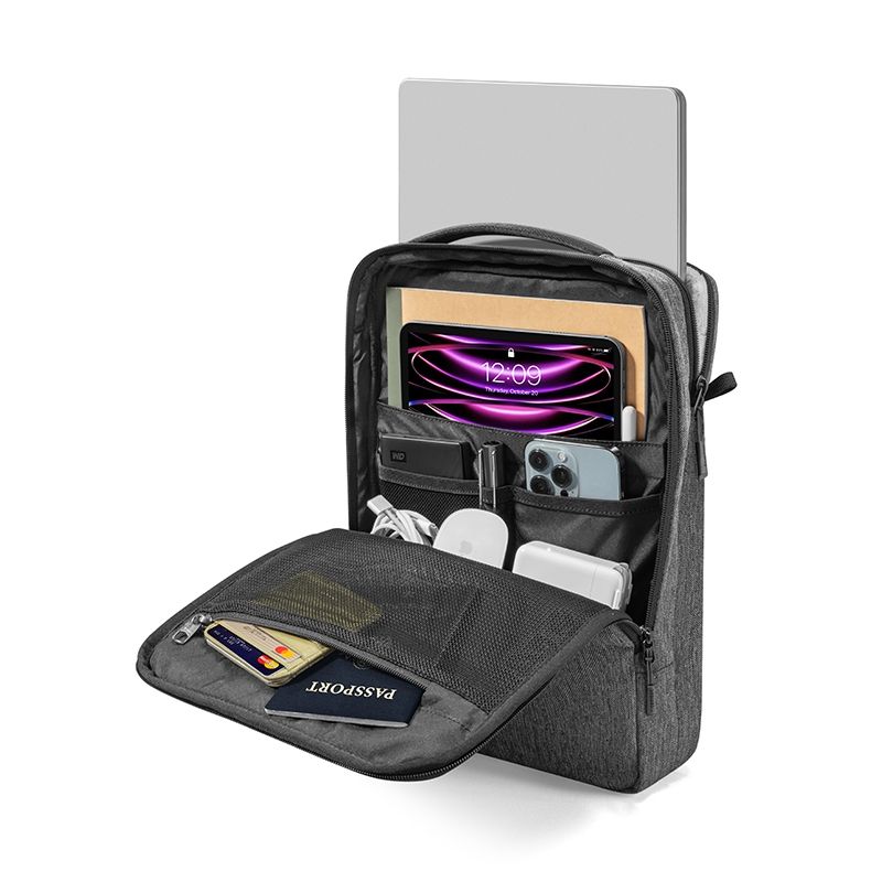 – Khoang túi chính có thể truy cập vào máy tính xách tay của bạn một cách nhanh chóng, dễ dàng. Một một ngăn chính ngoài có ngăn để đựng iPad và các túi phụ kiện dễ dàng lưu trữ các phụ kiện như bộ sạc, bộ chuyển đổi, chuột, cáp, điện thoại, ví, v.v. tiện lợi khi đến công sở hay ra ngoài.