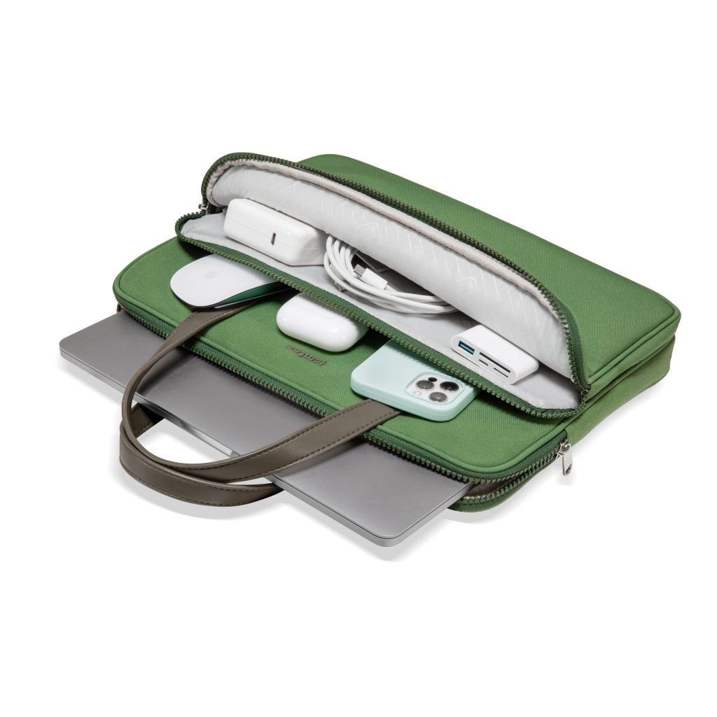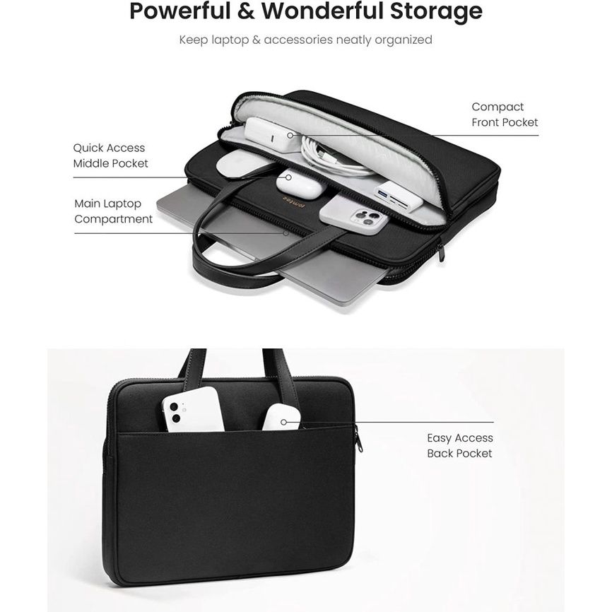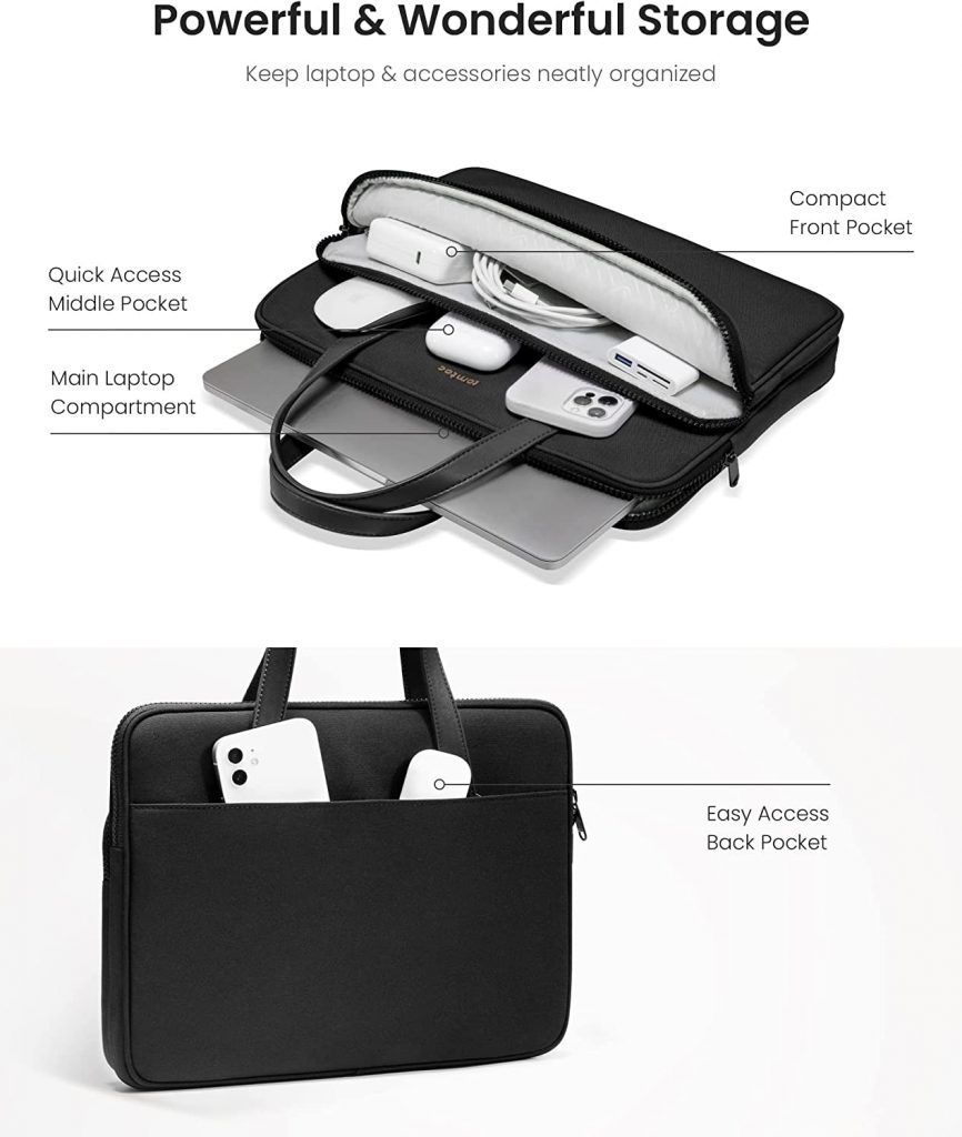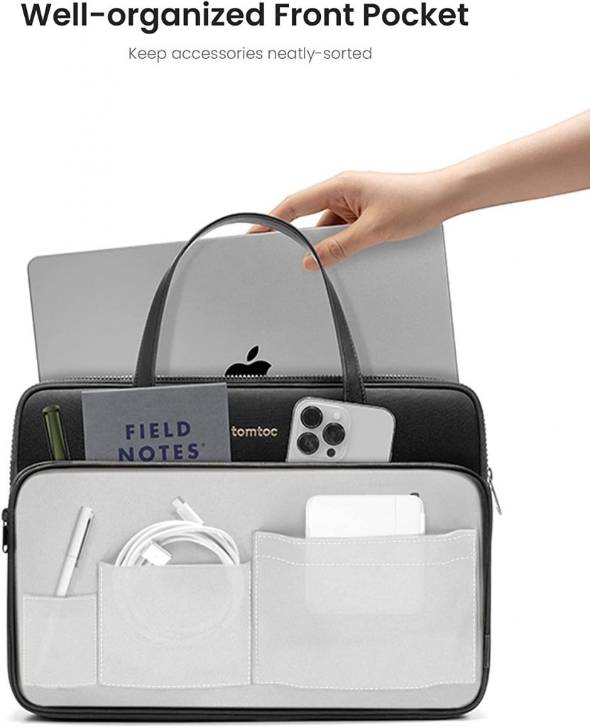 Túi đựng máy tính xách tay có bố cục đặc biệt và hệ thống tổ chức siêu chức năng. Nó có 4 ngăn lớn, ngăn trước với các túi nhỏ có lót cho các phụ kiện công nghệ hoặc vật dụng cá nhân, một túi từ tính tiện ích thao tác nhanh ẩn ở giữa dành cho bàn phím không dây, v.v., túi chính có thể chứa máy tính xách tay lên đến 14 “và một túi từ tính phía sau cho điện thoại, tài liệu hoặc nhiều vật có giá trị hơn